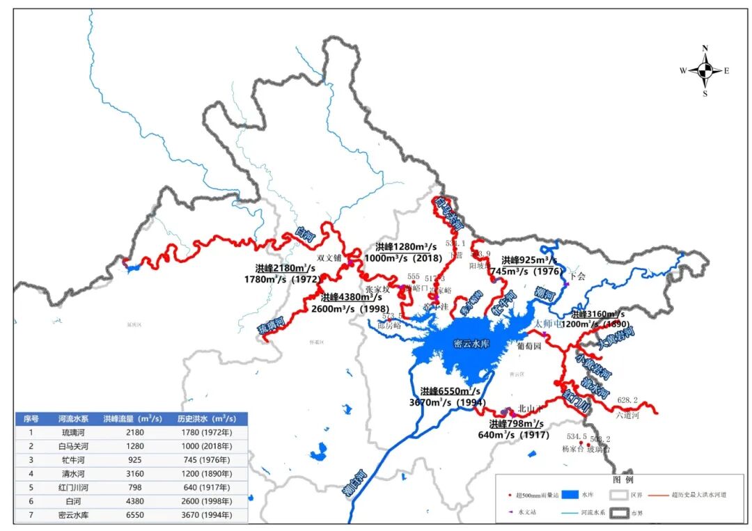 根据水文资料,本轮强降雨过程造成汇入密云水库或潮河、白河干流的琉璃河、白马关河、牤牛河、清水河、红门川河等多条中小河流,以及入库主要河流白河的洪峰流量,均超过历史监测或历史调查最大洪水*。