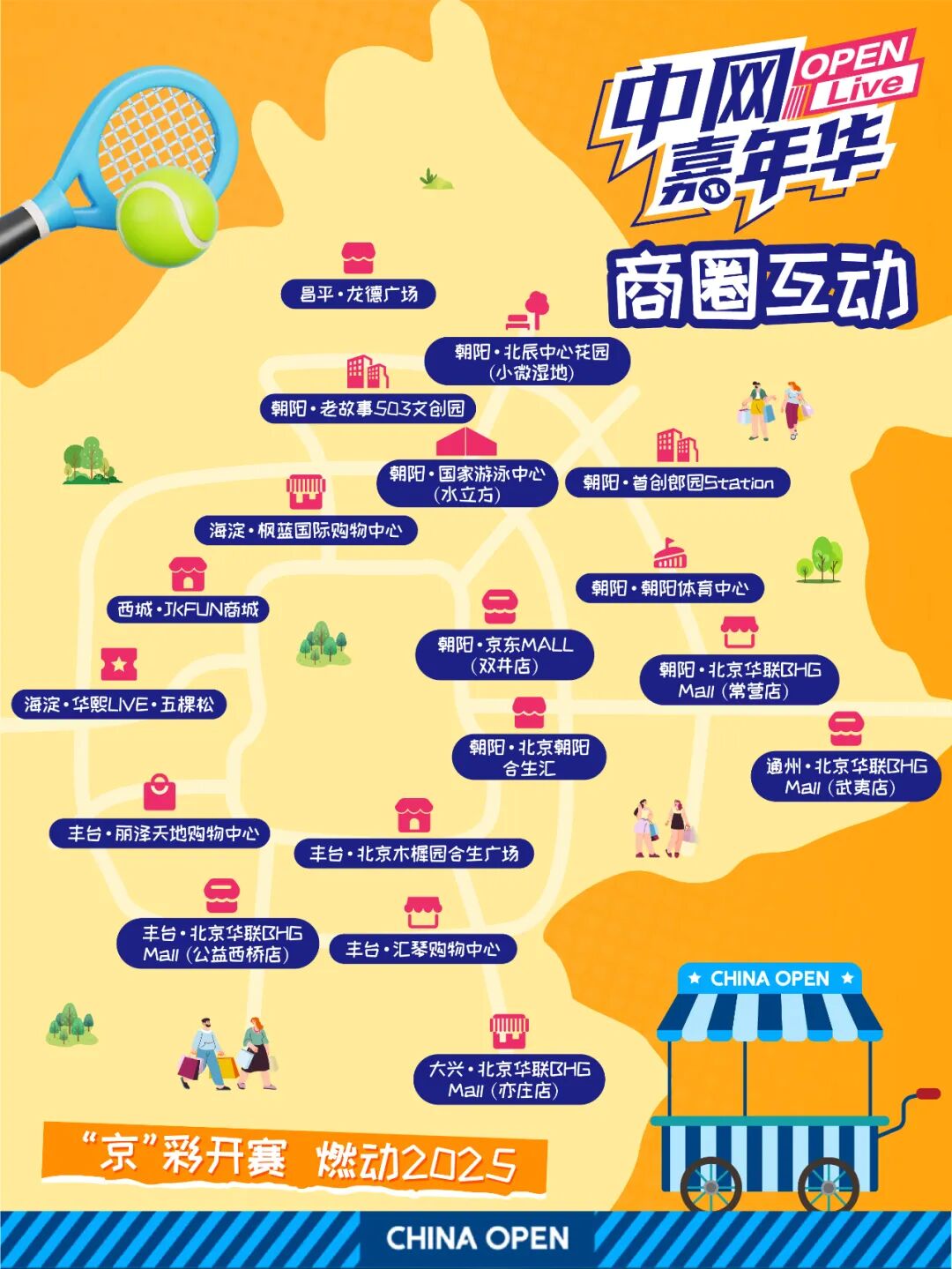 其中三大“超现场”各具特色:北京首创奥特莱斯结合商业消费,打造“城市运动季”;朝阳798·751园区融合艺术与运动,举办“艺起中网·国庆游园会”;通州运河西岸则依托水岸特色,推出“西岸·美好生活节”。此外,从隆福寺到西单更新场,从西北旺万象汇到隐墨书店,9个特色观赛点遍布京城,形成全覆盖的观赛网络。武汉首创奥特莱斯也首次加入,将网球热情延伸至京外。商圈互动:18家商场转角遇到中网中网赛事信号将同步覆盖18家大型商圈,让市民在购物休闲之余也能感受网球魅力。