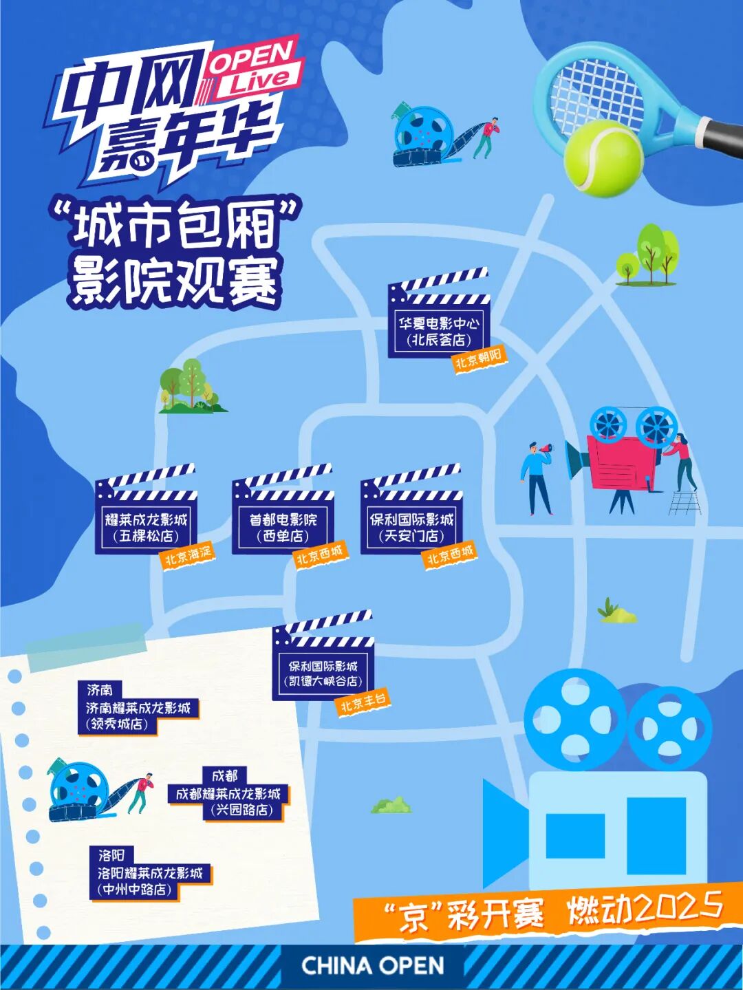 华熙LIVE·五棵松推出“中网礼遇”活动,凭票根可在50多家餐饮商户享受专属优惠;木樨园合生广场举办网球趣味赛,扩大网球运动群众基础;北辰中心花园结合“啤酒花园”概念,打造轻松观赛氛围。这一模式将体育赛事自然融入城市商业脉搏,激发消费新活力。影院观赛:8家影院提供专业观赛体验对于追求专业观赛体验的球迷,中网在全国8家影院设置“城市包厢”,提供半决赛和决赛的高码流专属信号。这些影院观赛点营造符合网球礼仪的专业氛围,随票附赠专属纪念票根,并有机会获得球星签名海报和限定款纪念品,让球迷享受“包厢级”观赛体验。