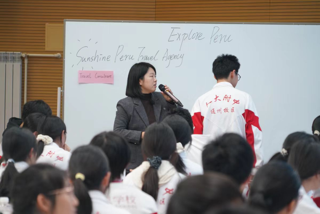 在课堂展示环节,常雪垠老师巧妙设计高一年级英语课“阳光秘鲁”旅游推介项目,学生化身“旅行社咨询师”、“多媒体专家”和“文化研究员”,在“情境化阅读圈”中协作探究。他们不仅需为不同文化背景的“游客”定制旅行方案,更要用流利英语进行推介,语言运用与跨文化理解能力在真实任务中自然融合、同步提升。