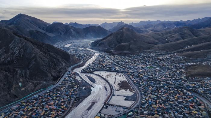 这是1月30日在青海省玉树藏族自治州杂多县境内拍摄的冬景风光(无人机照片)。