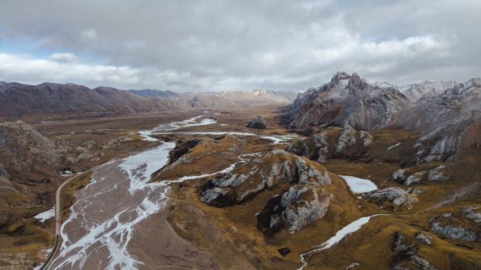 这是1月30日拍摄的青海省玉树藏族自治州杂多县冬景风光(无人机照片)。