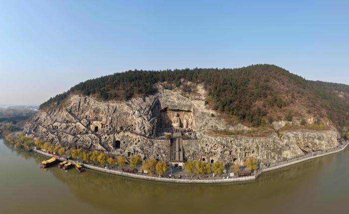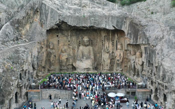 新中国成立初期,地处黄河中游、中原腹地的洛阳成为全国八个重点建设的工业城市之一。洛阳在老城以西八公里外的涧河西岸新建工业区,探索出“避开老城建新城”的洛阳模式,保护了这座名城的历史文化肌理。2025年4月24日,游客在河南省洛阳市龙门石窟景区游览(无人机照片)。新华社记者 李嘉南 摄