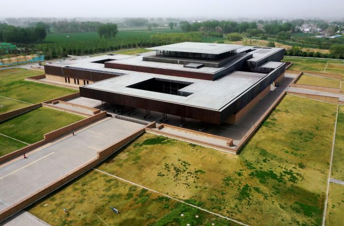 这是2025年4月16日在河南省洛阳市偃师区拍摄的二里头夏都遗址博物馆(无人机照片)。新华社记者 李嘉南 摄