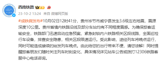 据@西南铁路消息,10月02日12时41分,贵州毕节市威宁县发生3.6级左右地震,震源深度10公里。贵州省境内铁路沿线及部分车站均有不同程度震感。为确保旅客运输安全,铁路部门迅速启动应急预案,紧急封锁内六铁路相关区段线路,全面巡检行车设备,排查安全隐患,相关区段限速运行。受此影响,途经列车将晚点运行,同时可能造成接续的始发列车晚点。由此给您的出行带来不便,请您谅解!同时提醒旅客朋友们随时关注列车时刻变化,具体情况详见站车公告或拨打12306铁路客服中心电话咨询。