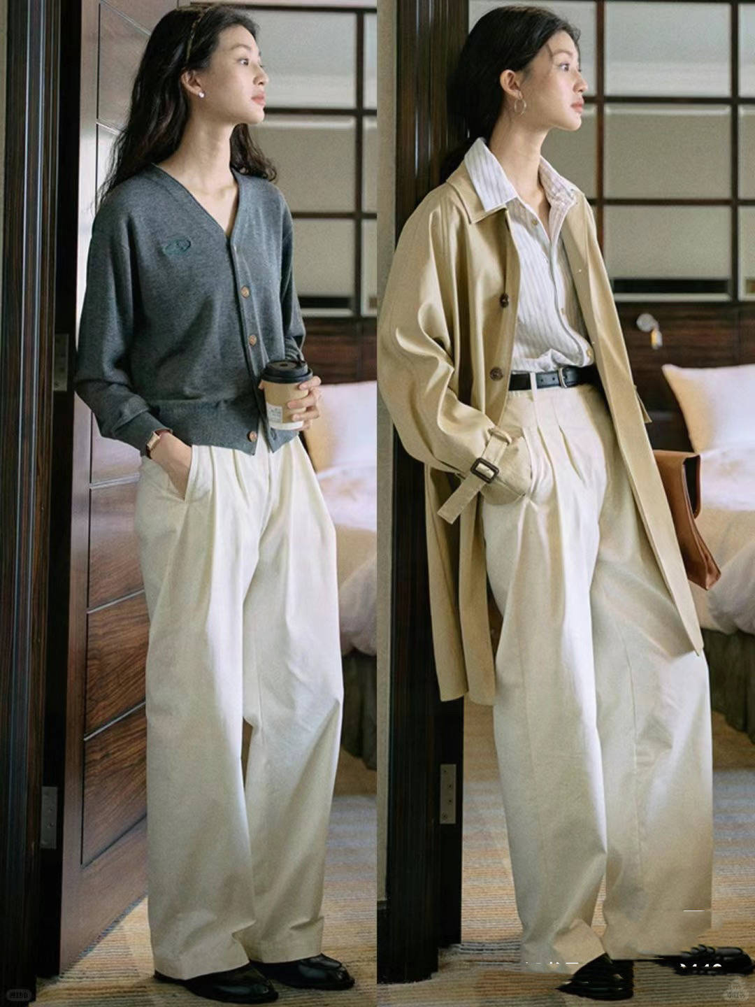 比如灰色系的针织衫、或者蓝白条纹的衬衫,都可以搭配一条高腰的白色直筒裤。看似简约基础的穿搭,却透着更加朴素沉稳的姿态,搭一件卡其色风衣、更具时尚。