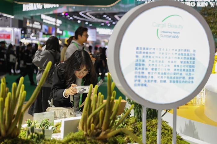 进博会“全勤生”们的参会热情印证了中国持续推动高水平对外开放的坚定姿态,也彰显了中国为各国企业提供共享中国市场宝贵机遇的诚意。11月7日,参观者在位于农食产品展区的嘉吉公司展台驻足。嘉吉是进博会八届“全勤生”。新华社记者 王婧嫱 摄