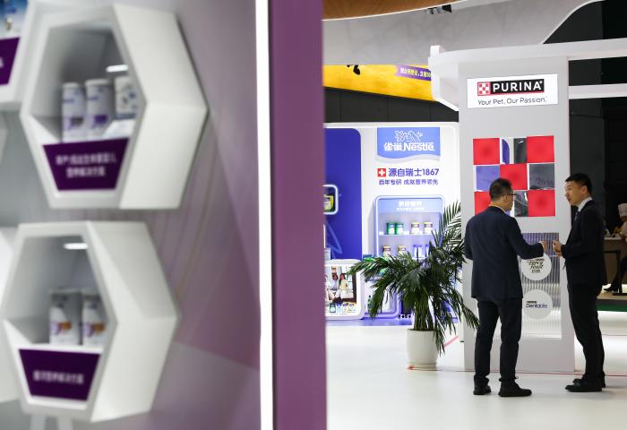 这是11月7日拍摄的位于农食产品展区的雀巢集团展台。雀巢是进博会八届“全勤生”。新华社记者 王婧嫱 摄