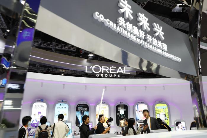 11月7日,参观者在消费品展区的欧莱雅集团展台参观。欧莱雅是进博会八届“全勤生”。新华社记者 王婧嫱 摄