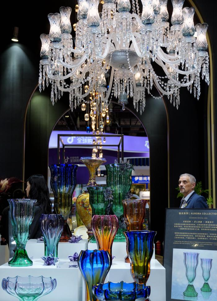 11月5日在消费品展区拍摄的欧若拉水晶展台。欧若拉水晶是进博会八届“全勤生”。 新华社记者 刘颖 摄