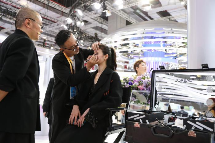 11月7日,一名参观者在消费品展区的欧莱雅展台体验美妆服务。欧莱雅是进博会八届“全勤生”。新华社记者 王婧嫱 摄