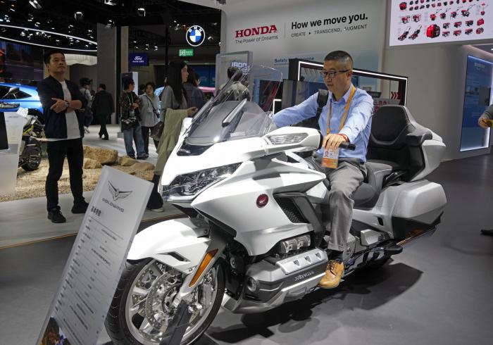 11月6日,在汽车及智慧出行展区本田展台,参观者体验摩托车展品。本田是进博会八届“全勤生”。新华社记者 刘颖 摄