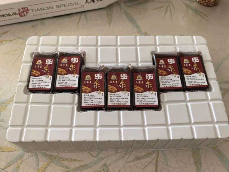 另一款实测的天津特产栗子羹产品,其包装误导性更为明显。该产品外盒为透明倒“凸”字形,从外观看,栗子羹从左至右码放整齐,给人一种满满一盒的直观感受。但打开包装后,实际内容却与视觉预期相去甚远——一整盒内仅有7块栗子羹。经测量,外包装长27厘米、宽16厘米、厚4厘米,整体体积达1728立方厘米;而单支栗子羹体积仅约36立方厘米,按外包装容积推算,理论上可放置48块。为让少量产品撑满包装高度,生产厂家在放置栗子羹的硬质塑料内托上做了凹陷设计,将栗子羹嵌入其中,其余空间均为塑料内托。这款产品标注净含量为260克,但未标明具体块数。北青报记者称重显示,单块栗子羹约38克,7块总重271克,虽未缺斤短两,但视觉上的“虚胖”包装依然让实测者感受到强烈的视觉欺骗。