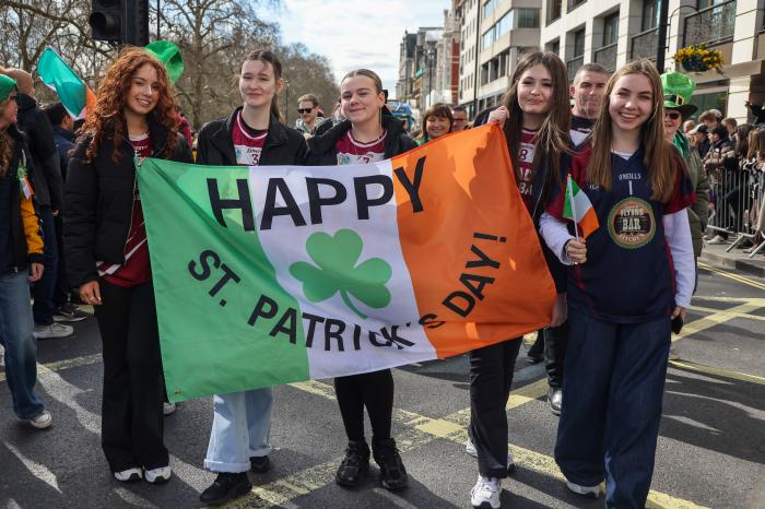 3月15日,人们在英国伦敦参加圣帕特里克节游行。