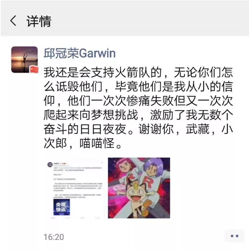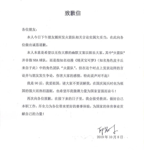 之后,邱冠荣发布致歉信为朋友圈所发火箭队相关言论致歉。他在致歉信中澄清,自己朋友圈所说的“火箭队”并非指NBA火箭队,而是指知名动漫《精灵宝可梦》中的角色团队“火箭队”。“但在这个时点上发表这样的言论并与朋友发生争论,伤害大家的感情,特地说声对不起!”
