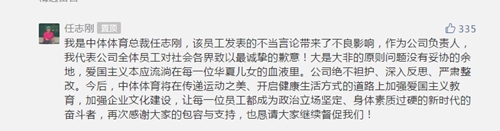 此外,自称为中体体育总裁任志刚的留言还被置顶,其表示,该员工发表的不当言论带来了不良影响,作为公司负责人,代表公司全体员工对社会各界致以最诚挚的歉意。
