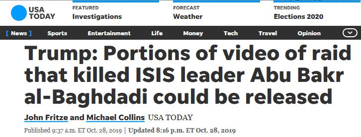 [环球网报道]美国总统特朗普27日宣布“极端组织‘伊斯兰国’(IS)头目巴格达迪在美军袭击中死亡”后,据《今日美国报》28日报道,他当天表示,可能会向公众公布突袭行动的部分视频。