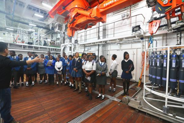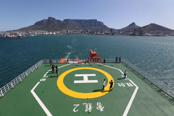 1月22日,科考队员为开普敦中学生讲解“雪龙2”号科考设备。这是“雪龙2”号第三次穿越西风带,第二次前往南极地区。在开普敦停靠期间,“雪龙2”号完成了人员更换和燃油、淡水、食品补给,还接待了南非环境部组织的当地百名中学生上船参观。