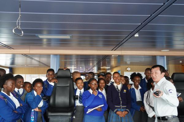 1月22日,船上驾驶员向开普敦中学生介绍“雪龙2”号(摄于1月22日)。搭载中国第36次南极考察队队员的“雪龙2”号极地科考破冰船北京时间23日22时(当地时间23日16时)驶离南非开普敦港,前往南极长城站。