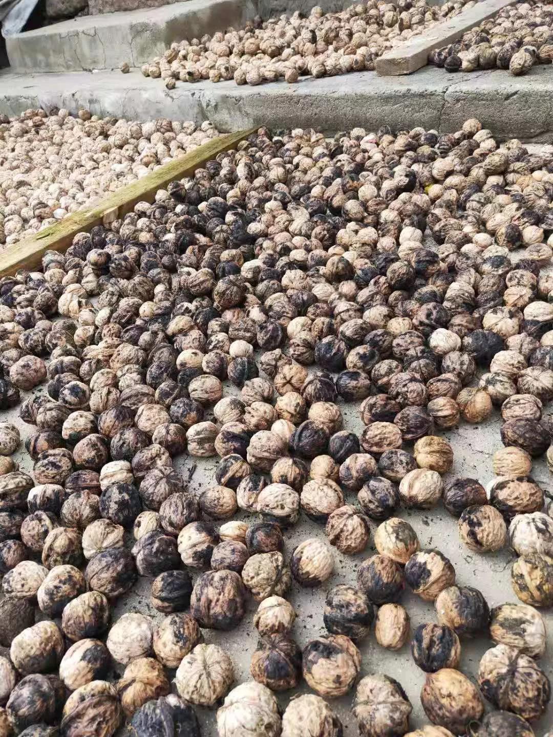 核桃落到地上时,有些会直接将青皮一起脱掉,露出带有黄褐色纹理的壳。当然更多的是还带着青皮的果实,被村民背回家,倒在院子里,然后用刀一颗一颗剥开还带着汁水的青皮,晾晒铺开成一片颜色并不均匀的毯面。
