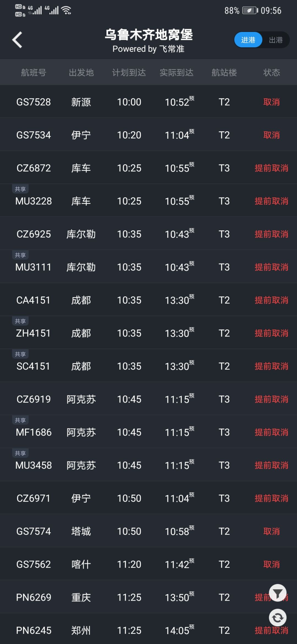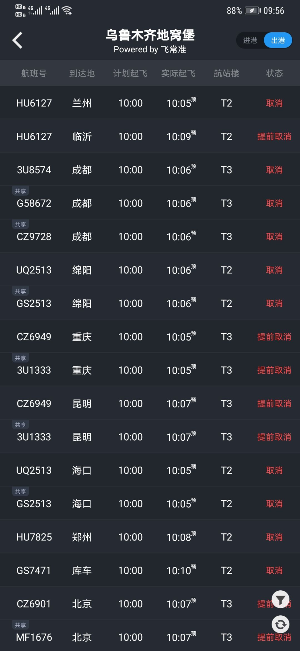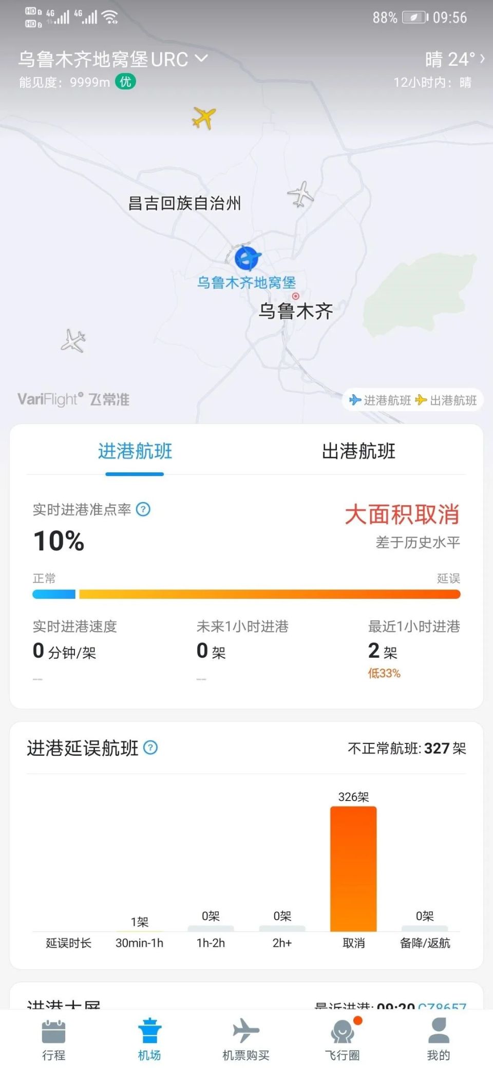 受疫情防控情况影响,17日乌鲁木齐机场航班大量取消,飞常准数据显示,截至9:55进港航班取消326架次,出港航班取消302架次。