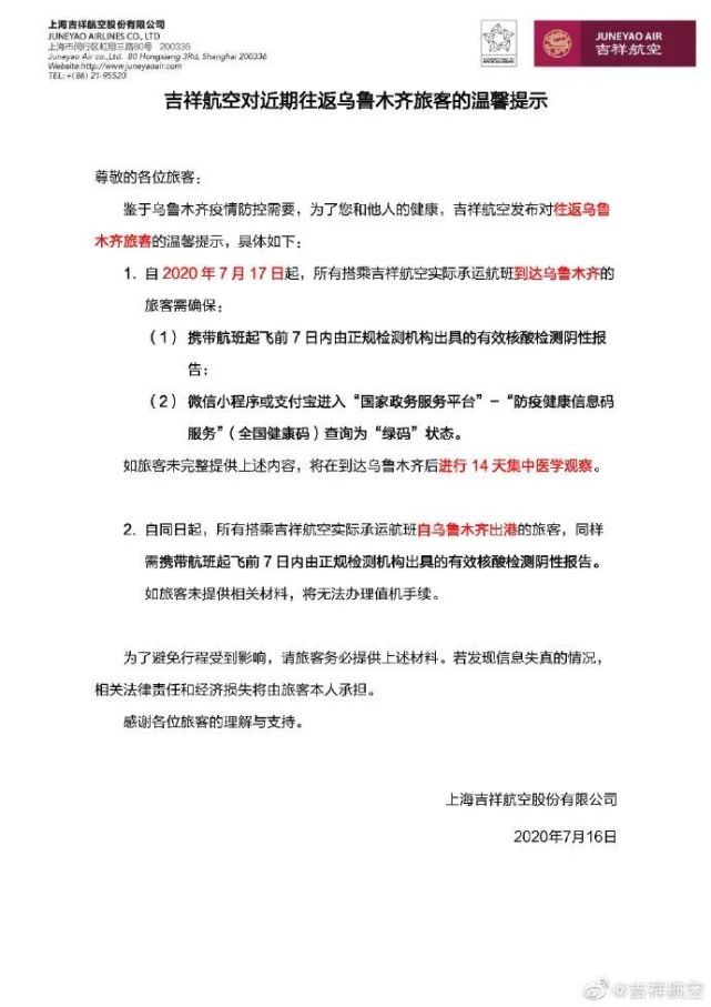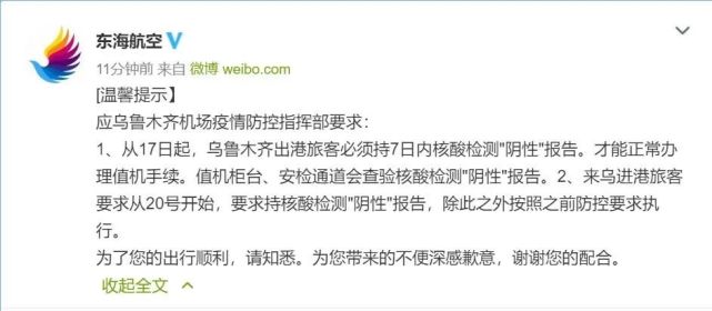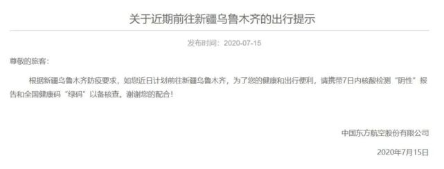 目前,多家航空公司已经向旅客发出近期前往乌鲁木齐的出行防疫提示,进出乌鲁木齐旅客需提供7天内核酸检测阴性报告。