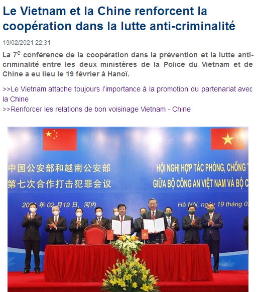报道积极评价了越中两国公安部第六次合作打击犯罪会议以来取得的积极成效并表示,双方在打击犯罪尤其是毒品犯罪、高科技犯罪、经济犯罪等领域中保持积极配合,为维护两国的政治安全和社会稳定发挥了重要作用。