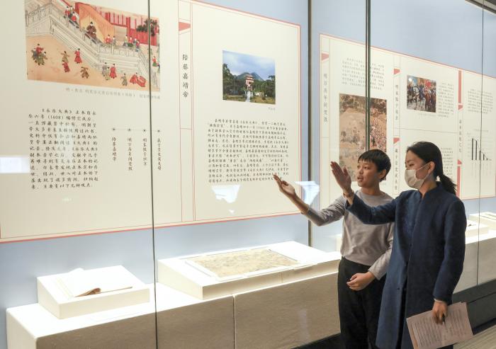 11月22日,一名学生(左)在国家典籍博物馆内学习如何介绍中华优秀传统文化。
