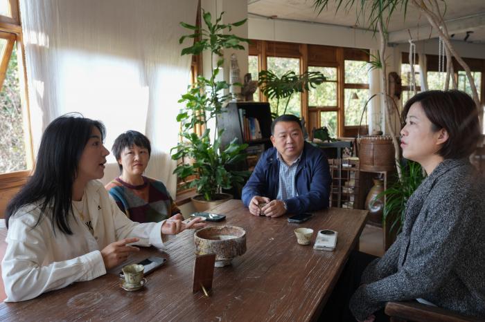2025年11月14日,浙江省宁波市奉化区溪口镇东山村乡村CEO胡亮玉(左一)与民宿主徐小风(左二)、董凤洁(右一)和东山村党支部书记、村委会主任徐佩伦(右二)在一起讨论民宿及文旅综合体项目发展。2024年,东山村“乡村CEO”(农村集体经济经理人)完成招募、竞聘、上岗。新华社记者 黄宗治 摄