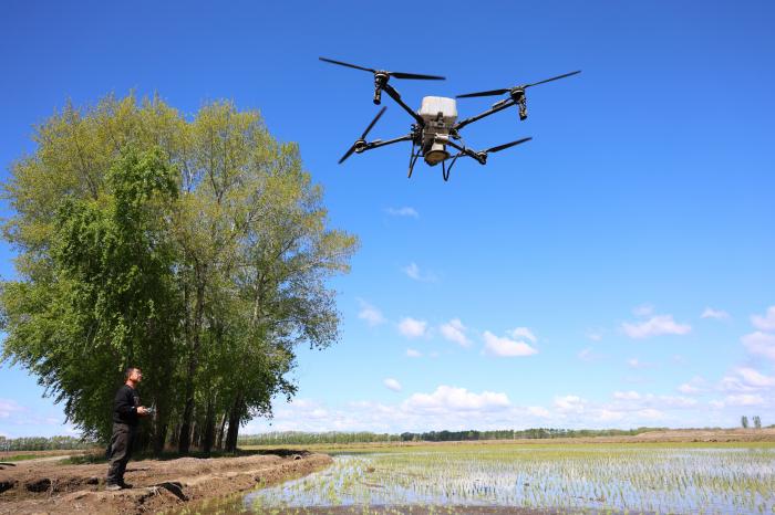 2025年5月21日,在北大荒集团黑龙江绥滨农场有限公司东井管理区,操作员操控搭载北斗导航系统的植保无人机,对即将施返青肥的地块进行打点。新华社发(李兴 摄)