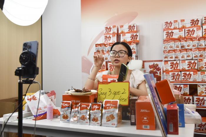 2025年4月25日,湖南长沙雨花区一家跨境电商公司的主播在海外社交平台上推销湖南特色商品。新华社记者 白田田 摄