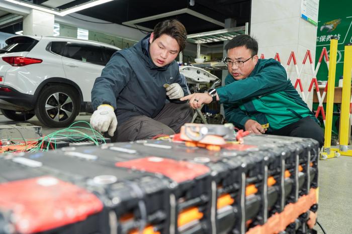 2024年12月9日,新能源汽车维修员赵飞(右)在安徽省合肥荣创汽车服务有限公司与同事一起做电池均衡。新华社记者 周牧 摄
