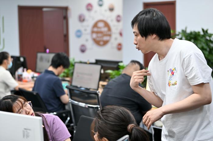2024年5月17日,听障人士张子悦在天津市南开区悦动广场的办公地上班。他是创美助残基地的人工智能训练师。新华社记者 李然 摄
