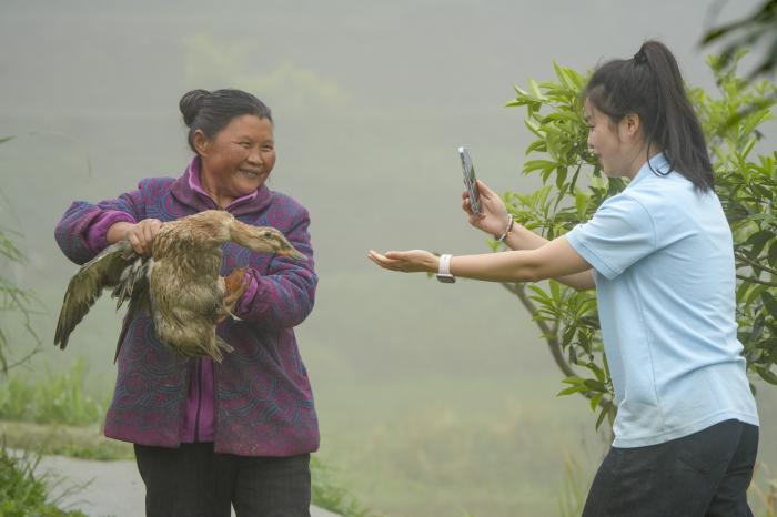 2025年4月24日,在重庆市綦江区三角镇中坝村,短视频内容创作者庞芳(右)拍摄短视频。新华社发(李晓果 摄)