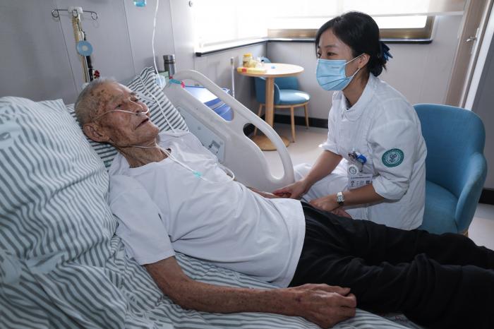 2024年9月5日,在浙江省绍兴市越城区东浦街道社区卫生服务中心的安宁疗护病房内,医护人员在查房并询问患者身体情况。新华社记者 徐昱 摄