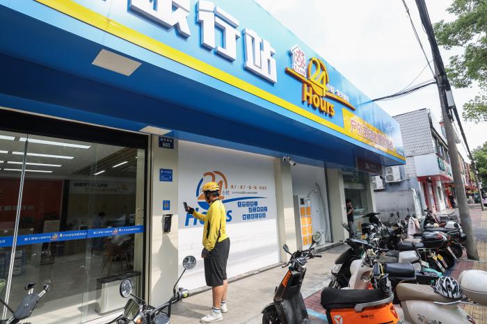 2025年8月26日,外卖骑手在浙江省嘉兴市南湖区越秀集市扫码进入24小时工会驿站(嘉工驿站工商银行站)。新华社记者 徐昱 摄