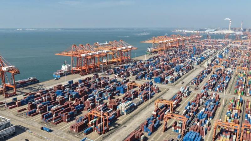11月29日,广西北部湾港钦州自动化码头集装箱有序堆叠摆放。(何家海 摄)
