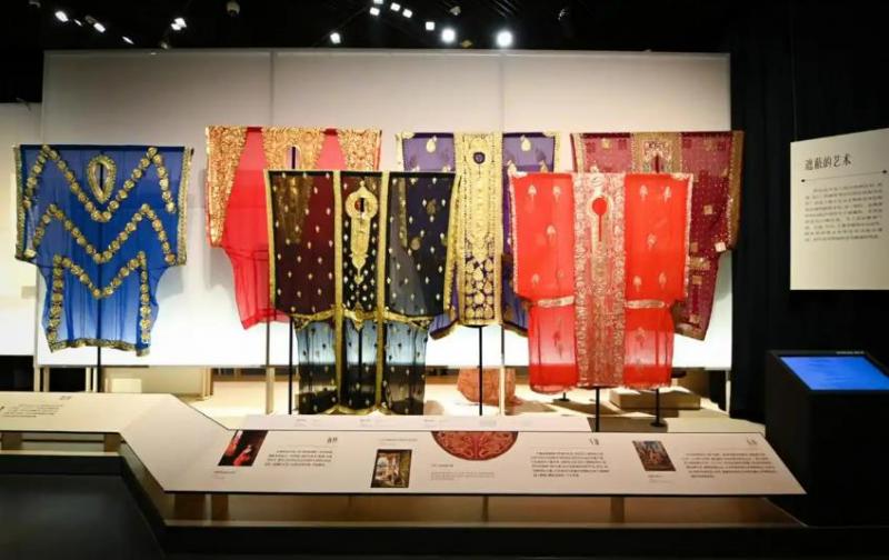 展览分为“日落金辉:马格里布的明亮服饰”“沙海星穹:中东地区的织金艺术”“天方织韵:阿拉伯半岛的信仰美学”“绫罗生香:印度与东南亚世界的金缕华裳”“经纬鎏光:东方丝国的金色记忆”五个单元,多角度展现各地织金服饰的技艺。