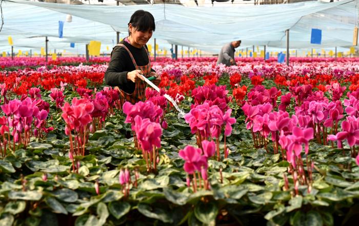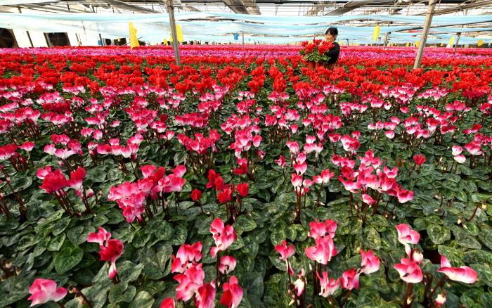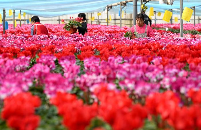 日前,在河北省石家庄市栾城区农林高科技园区花卉基地,20万株各类花卉娇艳绽放,花农们精心挑选并打包发货,供应市场。