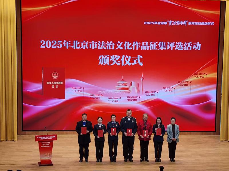 随后,与会领导为入围北京市“八五”普法品牌的单位代表、为法治文化作品征集评选活动获奖代表颁奖,共同启动北京市“宪法宣传周”系列活动,并参观北京市优秀法治文化作品展。