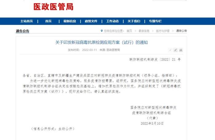 11日,国家卫健委官网发布消息,为进一步优化新冠病毒检测策略,根据疫情防控需要,国务院联防联控机制综合组研究决定,推进“抗原筛查、核酸诊断”的监测模式,在核酸检测基础上增加抗原检测作为补充。