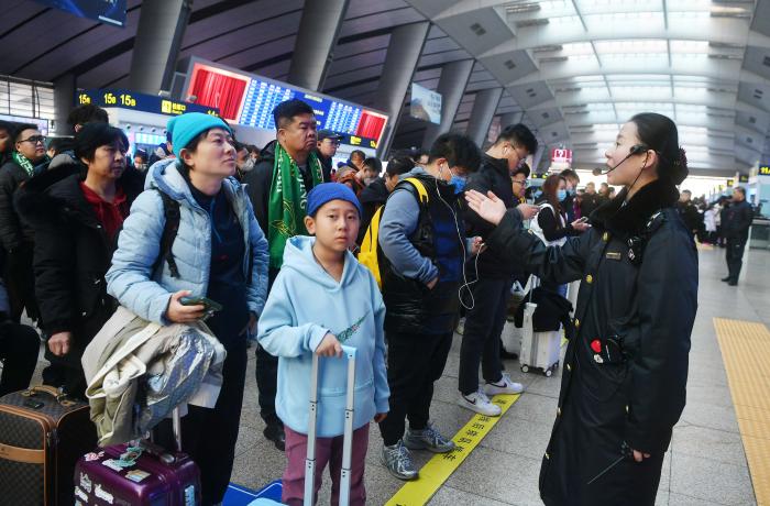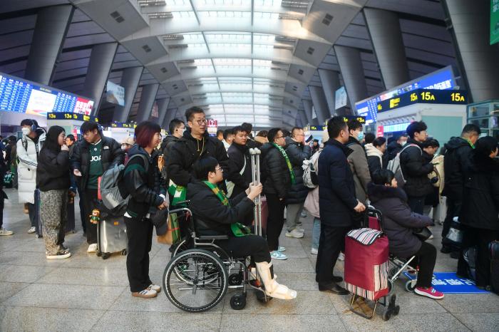 球迷在南站候车大厅候车。