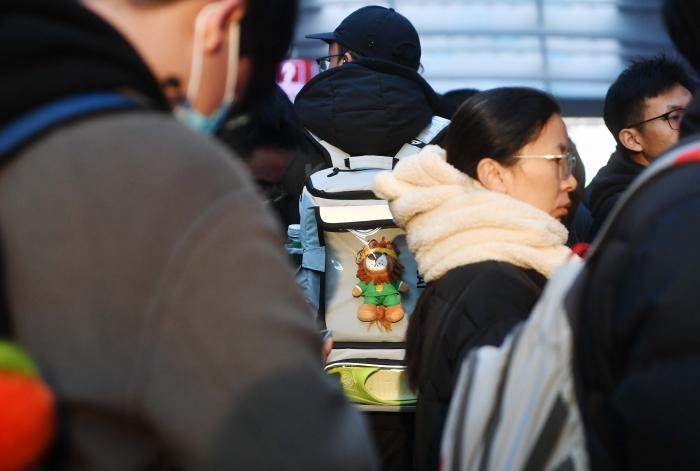 球迷背包上的国安队吉祥物“京狮”。