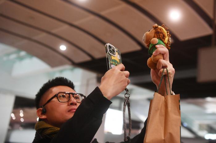 球迷拍摄国安队吉祥物“京狮”玩偶。