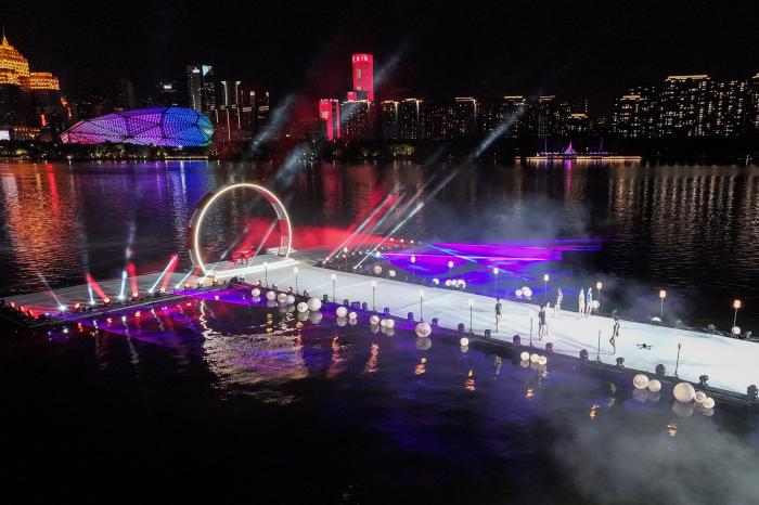 这是2024年9月2日在沈阳市浑河畔拍摄的2024沈阳旗袍文化周开幕式(无人机照片)。
