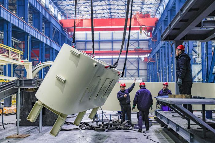 2023年1月13日,工人在位于沈阳市的北方重工有限公司车间吊装设备。
