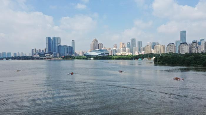 这是在沈阳市浑河上举办的2025年亚洲青年赛艇锦标赛比赛现场(2025年8月29日摄,无人机照片)。