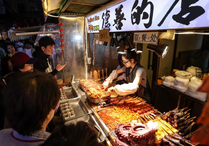 2025年5月2日,游客在沈阳市西塔商圈选购美食。