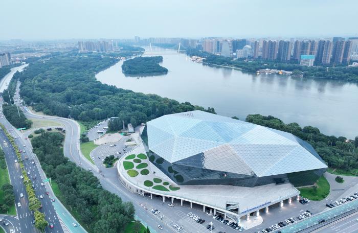 这是2025年7月31日拍摄的沈阳盛京大剧院附近的浑河两岸景色(无人机照片)。