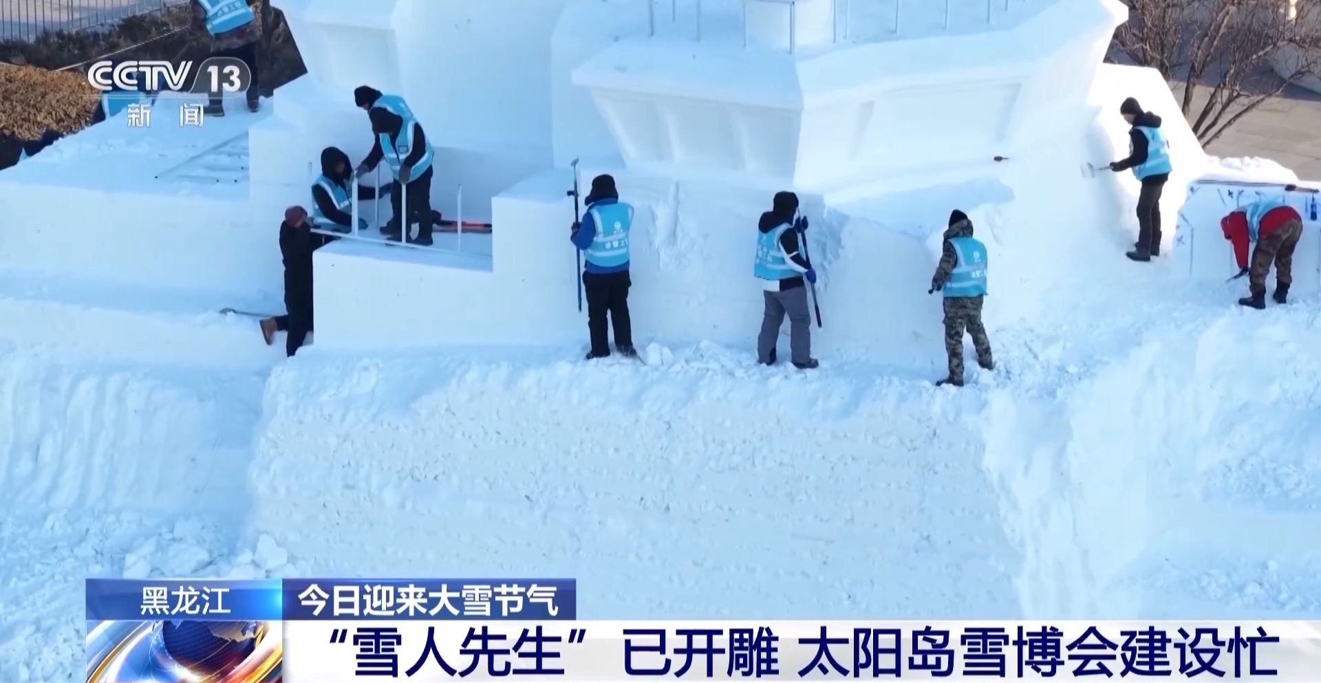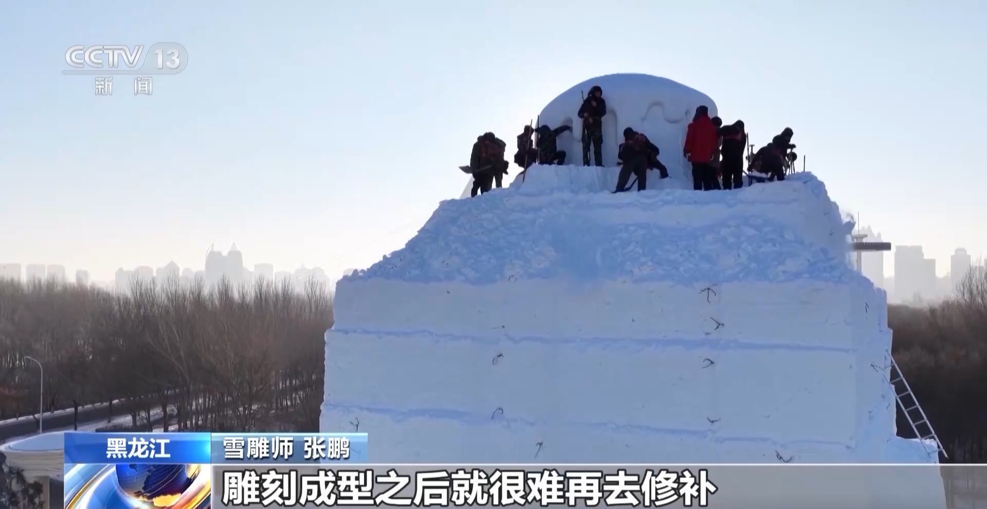 雪雕师 张鹏:因为雪雕我们都是一次性成型,雕刻成型之后就很难再去修补,“雪人先生”难度主要在于它整体上比例的把控,因为它的体量非常大,工人师傅在雕刻的时候要随时掌握它的比例大小。